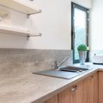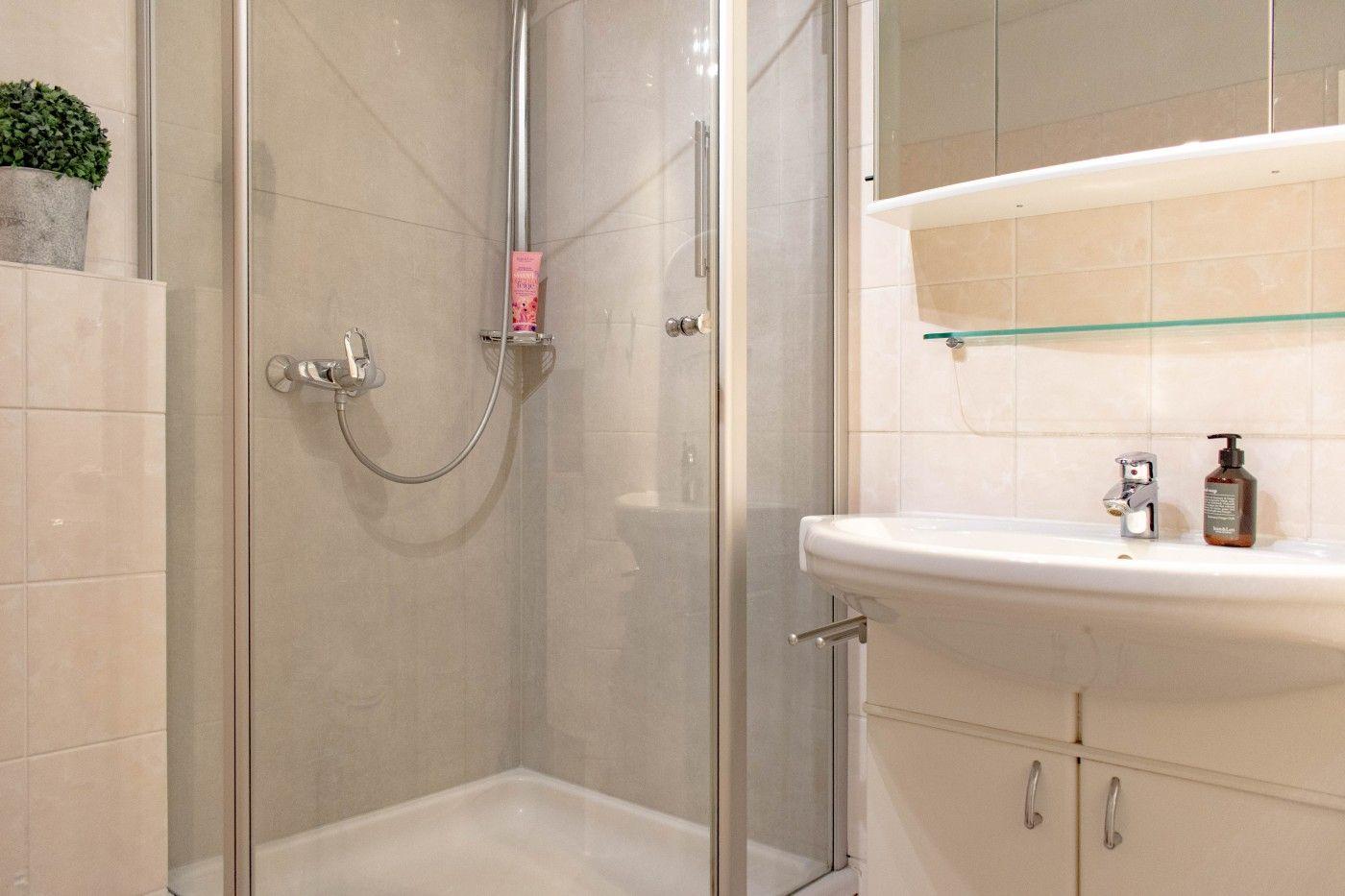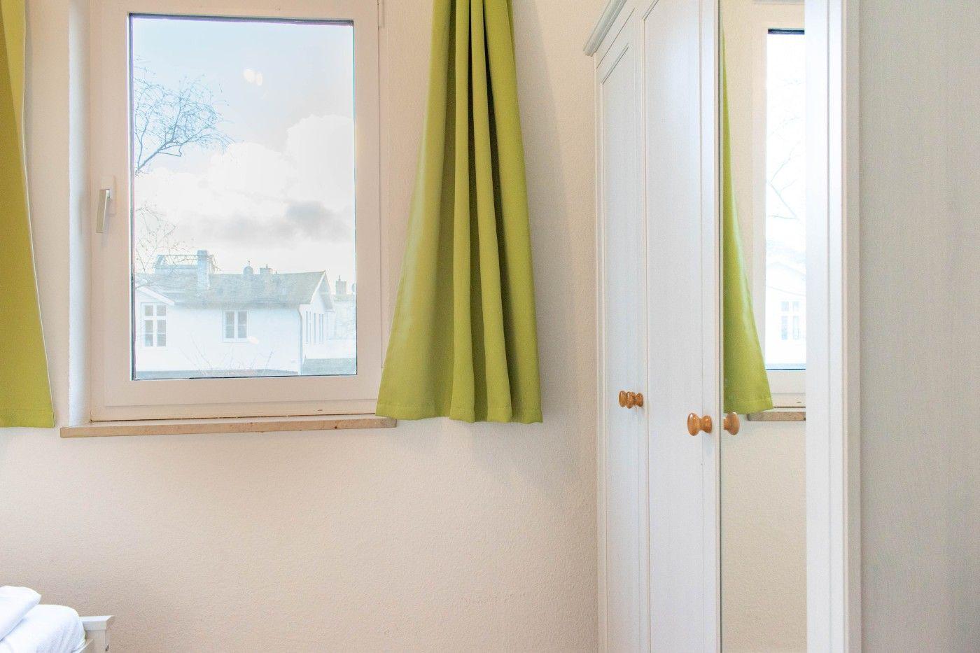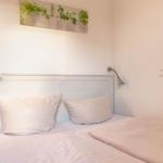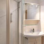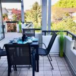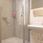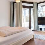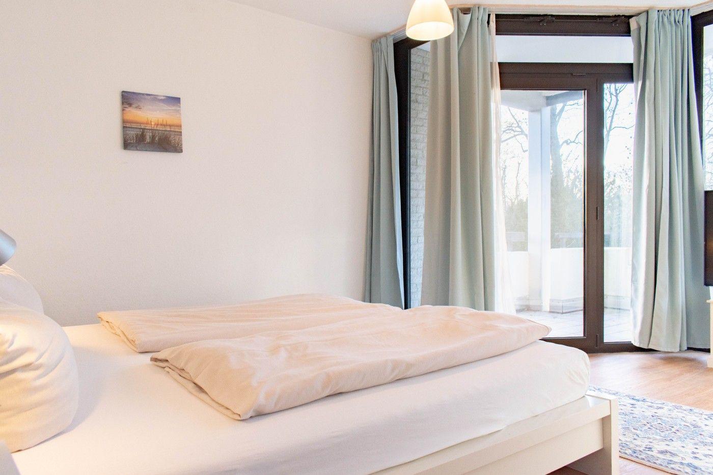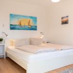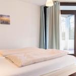 Drei Zimmer mit zwei Doppelbetten & Zustellbett, sowie Wohnbereich und Küche bieten Platz für fünf Gäste. Bodentiefe Fenster im Wohnzimmer sorgen den ganzen Tag für eine helle und freundliche Atmosphäre. Von dort aus gelangt man auf den südlich ausgerichteten Balkon mit Blick ins Grüne. Der Balkon erstreckt sich vom Wohnzimmer bis zu einem der Schlafzimmer. Der Wohnbereich ist mit einer gemütlichen Couch und Stühlen ausgestattet. In beiden Schlafzimmern stehen Doppelbetten und Kleiderschränke. Das Badezimmer ist ebenfalls hell und modern gestaltet (WC, Dusche mit Glasschiebetüren).