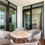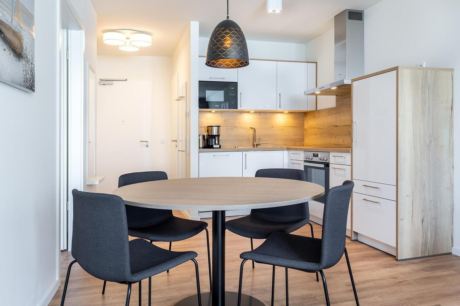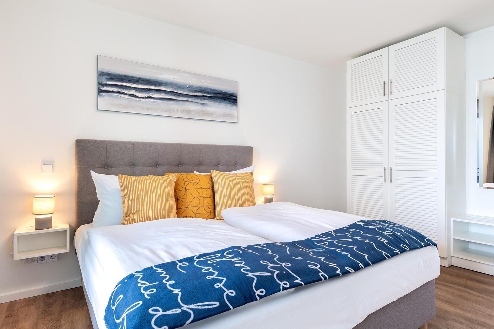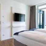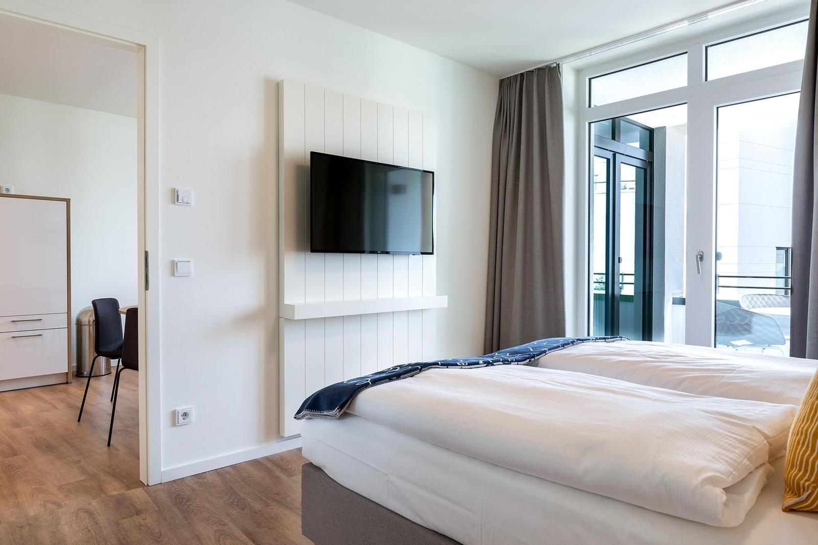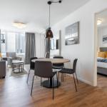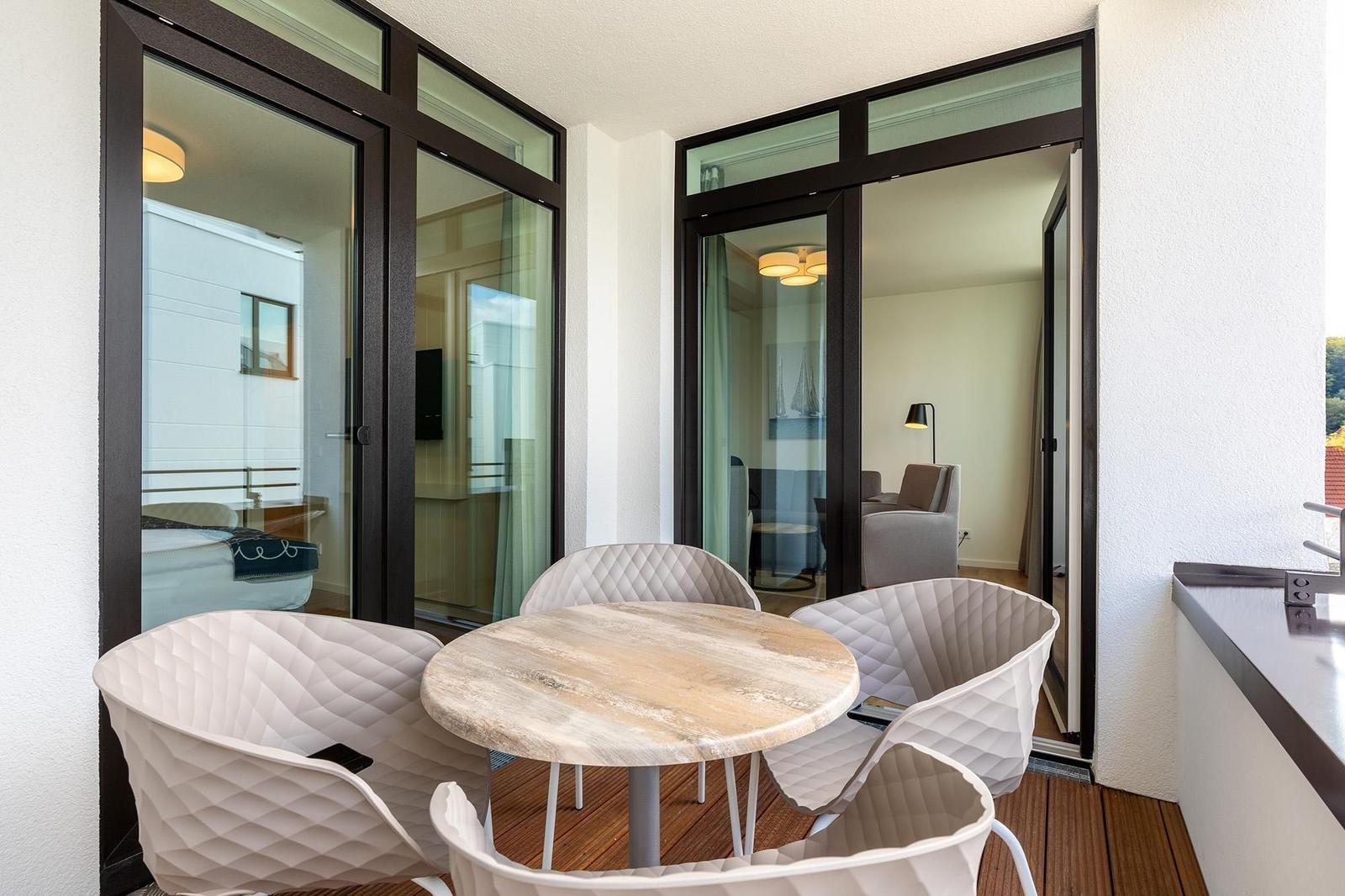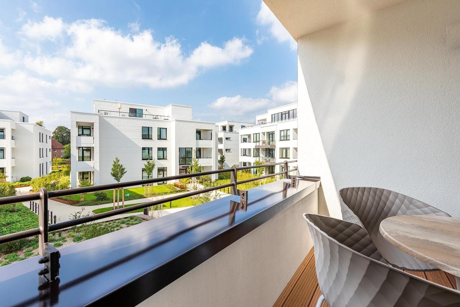 Im Godewindpark Travemünde erwartet der Außenbereich mit einer überdachten Loggia in sonniger Westlage, die sowohl vom Wohn- als auch vom Schlafzimmer aus zugänglich ist, unvergessliche Momente im Freien. Hier kann die maritime Ostseeatmosphäre bei entspannenden Stunden, einem Abendessen unter freiem Himmel oder einfach beim Ausblick auf den Abendhimmel genossen werden. Die Ferienanlage bietet zudem einen großzügigen 260 m² Wellnessbereich, der zur Erholung einlädt. Für aktive Gäste stehen abschließbare Kellerräume zur Verfügung, um Fahrräder sicher zu verwahren. Gemeinschaftlich nutzbare Waschmaschinen und Trockner sind auf jeder Etage vorhanden, was den Aufenthalt zusätzlich angenehm gestaltet. Die unmittelbare Nähe zu Einkaufsmöglichkeiten, Restaurants und dem Bahnhof rundet das attraktive Angebot ab.