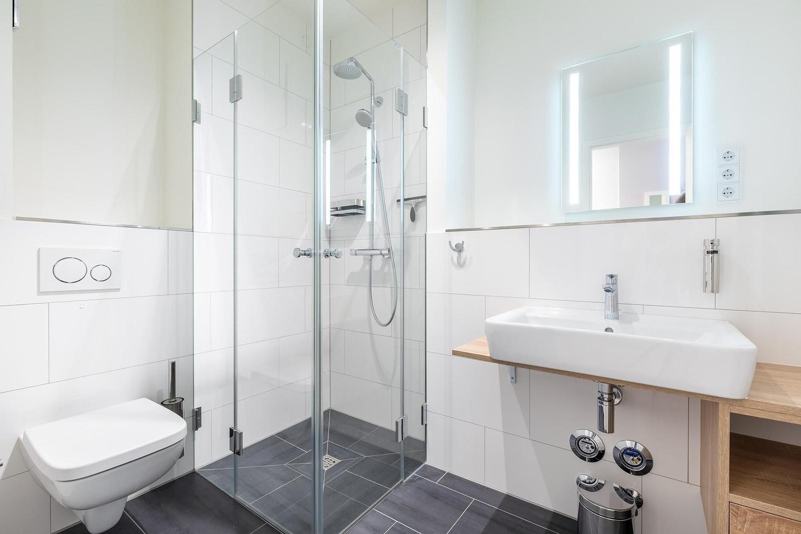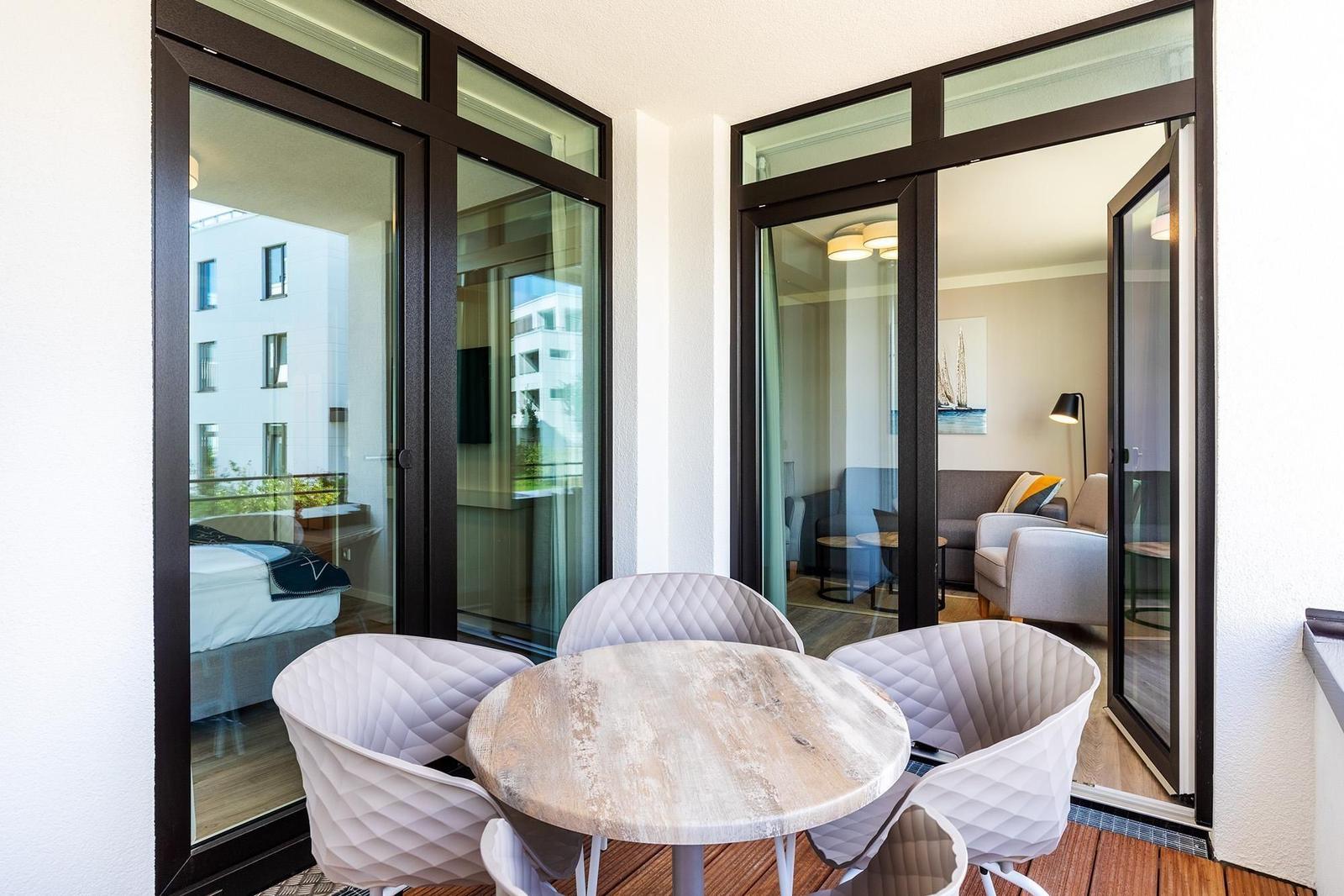 Das Godewindpark Travemünde Apartment 1.07 beeindruckt mit seinem modernen Ambiente auf etwa 49 m² im 1. Stock und bietet Platz für bis zu vier Personen. Es verfügt über ein separates Schlafzimmer mit hochwertiger Bettwäsche und einen hellen Wohnbereich, der ein komfortables Sofa, einen Sessel und einen Essbereich mit einer offen gestalteten, komplett ausgestatteten Küche umfasst. Besondere Ausstattungsmerkmale sind die Fußbodenheizung und eine Allergikerfreundlichkeit. Das stilvolle Bad ist mit einer bodengleichen Dusche ausgestattet. Ein überdachter Balkon sorgt für zusätzlichen Komfort. Gäste können zudem den 260 m² großen Wellnessbereich der Ferienanlage, sowie Waschmaschinen und Trockner im gemeinschaftlichen Bereich nutzen. Ein Tiefgaragenstellplatz und eine E-Ladestation runden das Angebot ab. Die Lage ermöglicht einen unmittelbaren Zugang zum Strand und zu Einkaufsmöglichkeiten.